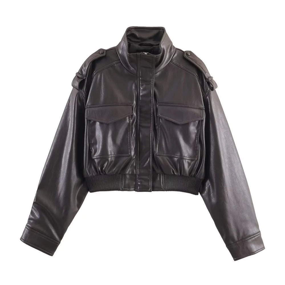 Cropped Faux Leather Jacket with Oversized Sleeves for Women